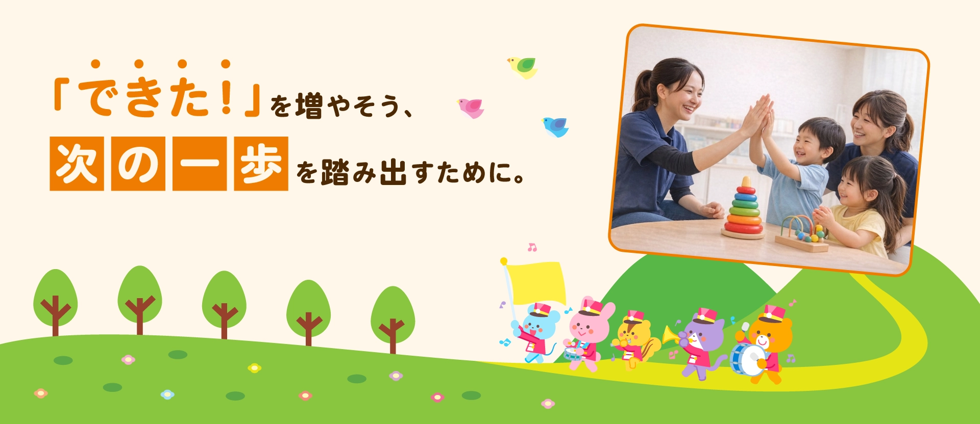 楽しく遊びながら「できた!」という喜びをともに感じ、笑顔で過ごせる場所をつくることが私たちの想いです。